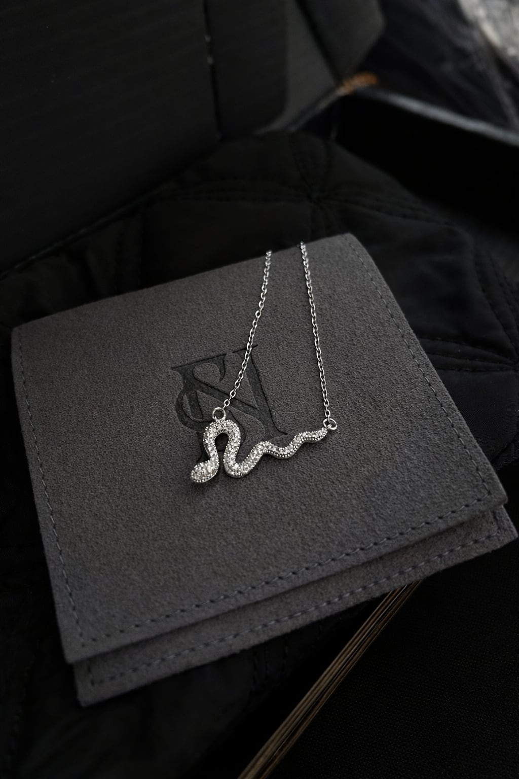 蛇のラインに沿ってあしらわれたジルコニアが、光を受けるたび上品に輝きます。